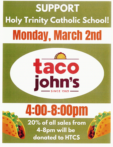 Taco John's is supporting Holy Trinity Catholic Schools 20% of all proceeds will be donated to help.